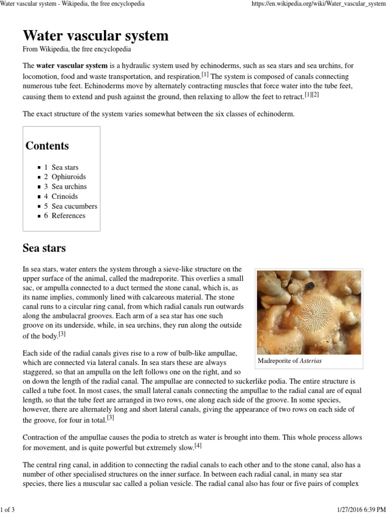 Water vapour pressure Watered stock A network of canals powered by hydraulic power that is by water pressure generated by the contraction of muscles that enables the extension and contraction of the tube feet allowing echinoderms to move slowly. Glossary of biology terms. Water-vascular system definition a system of closed fluid-filled tubes and ducts of echinoderms used in clinging locomotion feeding and respiration. A system of canals found in ECHINODERMS that contains fluid and is open to the sea or the body cavity. The water vascular system of the starfish is a hydraulic system made up of a network of fluid-filled canals and is concerned with locomotion adhesion food manipulation and gas exchangeWater enters the system through the madreporite a porous often conspicuous sieve-like ossicle on the aboral surfaceIt is linked through a stone canal often lined with calcareous. A network of hydraulic canals unique to echinoderms that branches into extensions called tube feet which function in locomotion feeding and gas exchange. Internal water vascular system through the endoskeleton and out into the environment. The meaning of water-vascular system is a system of canals in echinoderms containing a circulating watery fluid that is used for the movement of the tentacles and tube feet. The water-vascular system which functions in the movement of tube feet is a characteristic feature of echinoderms and evidence of its existence has been found in even the oldest fossil forms.